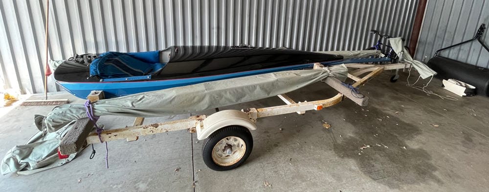 Needs main sheet, 3 of 4 mainsail battens, and halyard catch.
