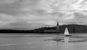 A splendid picture from Uppsala in Sweden with the famed historic ice yacht NORA and an Ice Optimist as they wait together for the wind to come up.