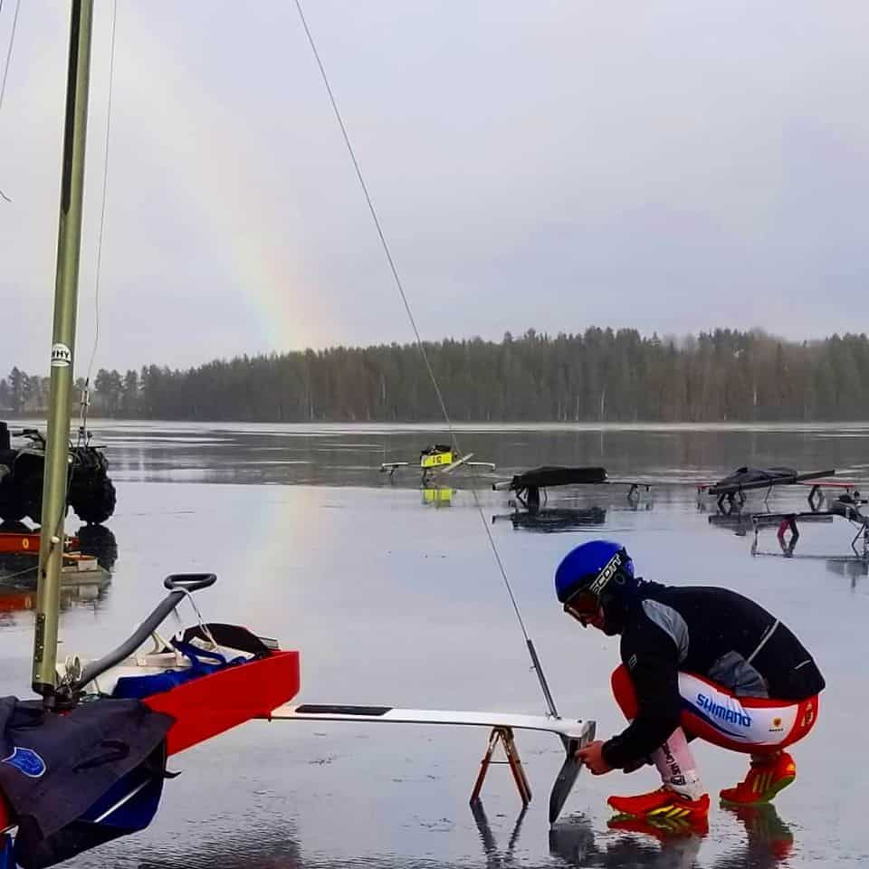 The World and European Junior Ice Sailing Championship concluded on February 20, 2020. It was one of the most amazing regattas I’ve ever seen for many reasons. Some of them include the first time being around so many young people who iceboat and the commitment and support their parents and coaches make to get them there and have a good experience. You can tell from the photos that the ice was fast. Both the DNs and Ice Optimist fleets showed a high level of sailing skill. The Lithuanian DN Ice Sailing club, organizers of the event, provided hot tea and cookies on the ice every day and the Uppsala, Sweden contingent organized hot lunch every day as well.
